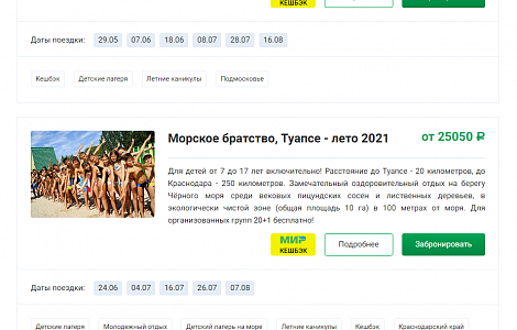 - на сайте туристической компании создан специальный раздел для размещения туров с кешбэком в детские лагеря