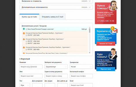 - корзина с возможностью выбора дополнительных услуг (трансферы, визы, питание, экскурсии)